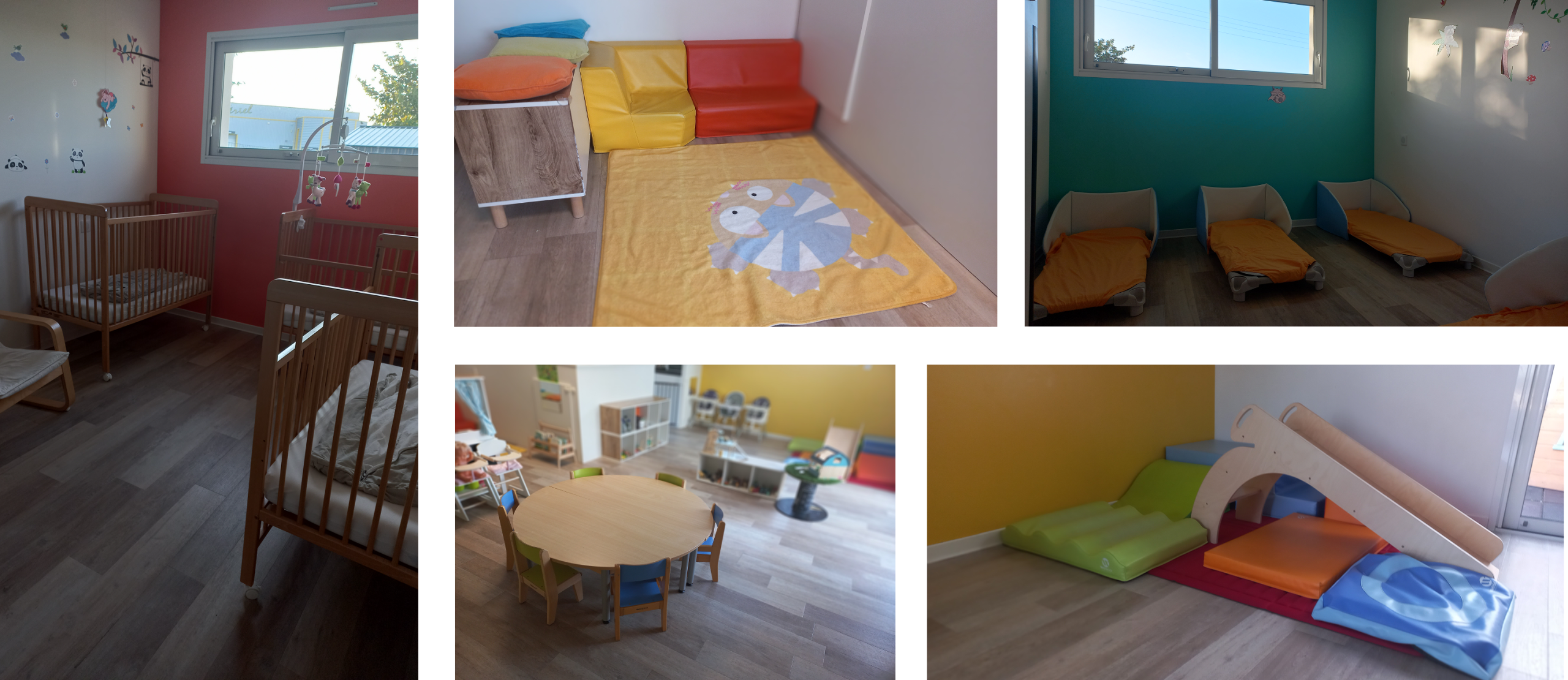 Pour la partie repos, le rythme de sommeil de chaque enfant est préservé grâce à trois dortoirs distincts organisés par tranches d'âge : bébés, moyens et grands.